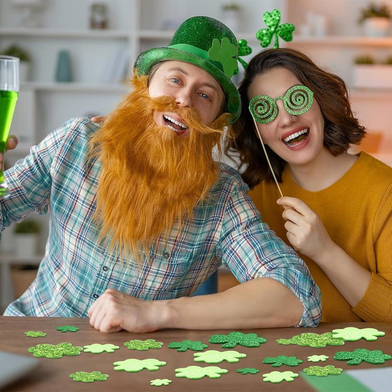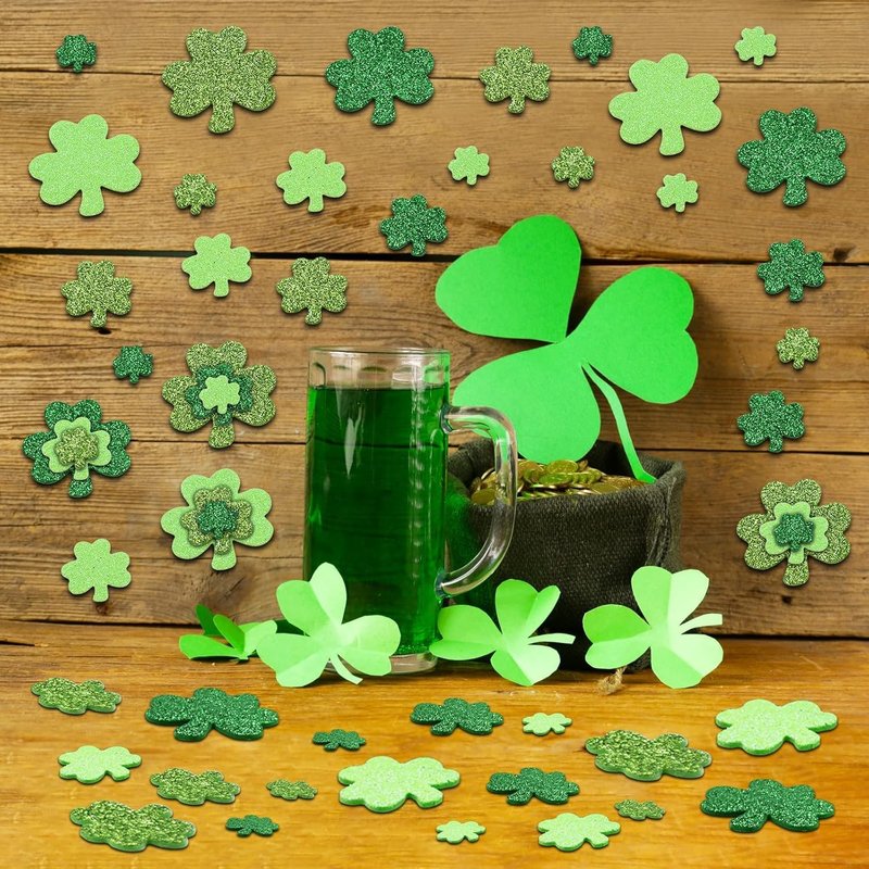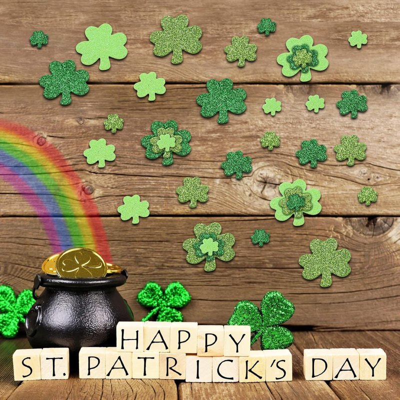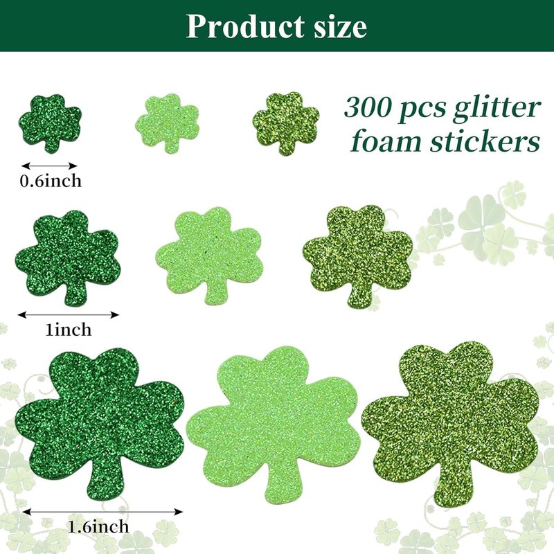 - Green Shamrock Foam Stickers - This set includes 300 pieces of green glitter shamrock foam stickers in 3 different sizes: 1.57 inches, 1 inch, and 0.6 inch. Made of premium quality EVA material, these stickers are durable, flexible, lightweight, odor-free, and have strong stickiness.