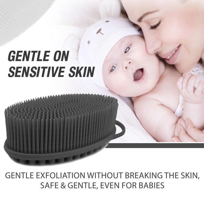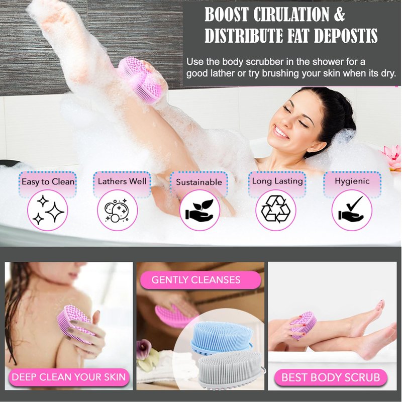 - NOW WITH LOOP HANDLE- For better grip and hangs easily in the shower for better drying. A silicone bath brush is more effective than using your hand, a washcloth, or a bristle brush to cleanse your skin. Silicone is a soft and safe material that can help exfoliate your skin. Rubbing the bristles into your skin stimulates blood circulation and can reduce cellulite in problem areas.