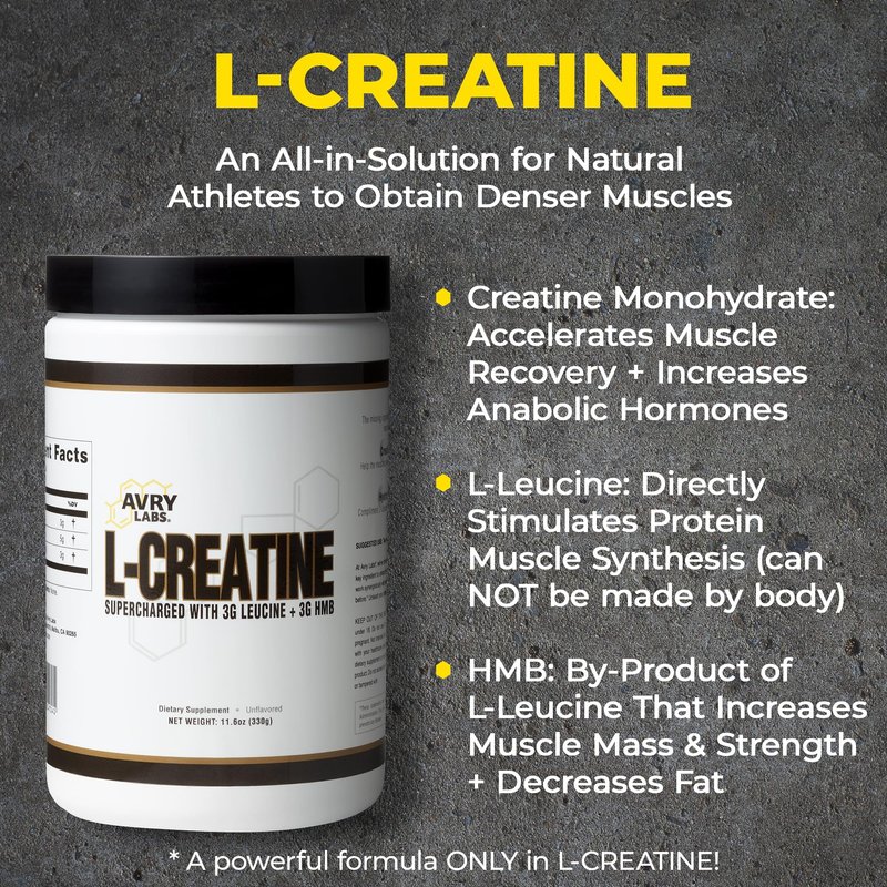 Avry Labs L-CREATINE Supplement: Creatine Monohydrate w/Leucine Amino Acid and HMB – Supports Muscle Mass, Strength, Recovery & Performance + Reduce Fat – Vegan, 11oz (330g) Powder