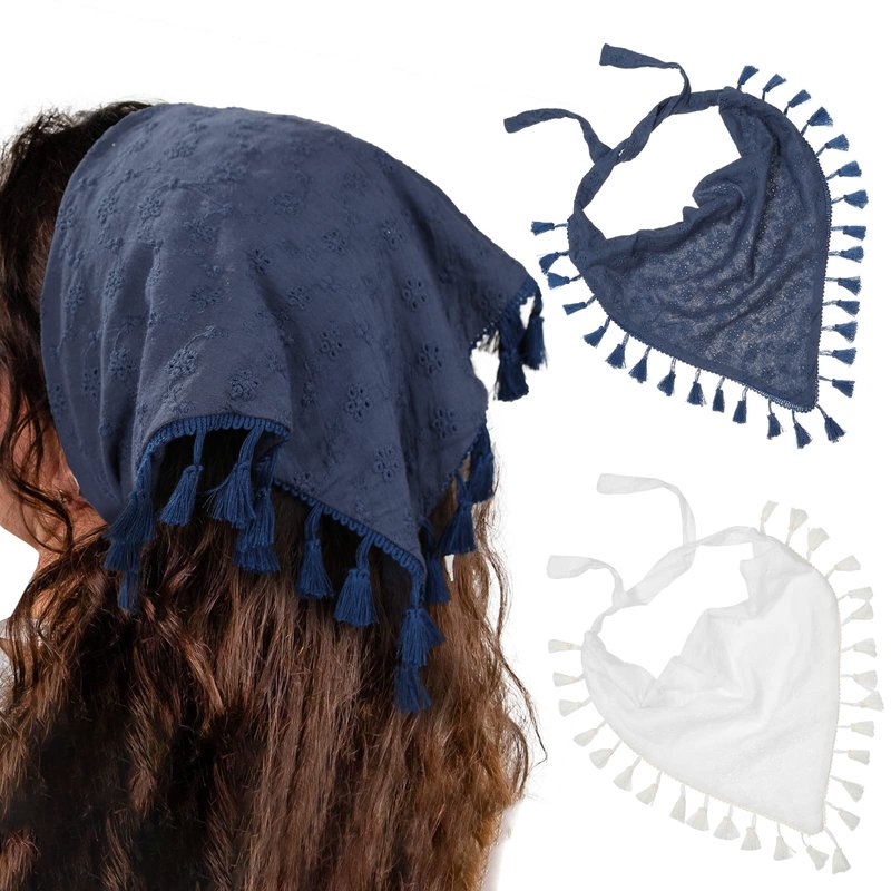 AWAYTR Floral Tassels Hair Scarf Headband - 2PCS Cotton Hair Bandana Scarf With Tassels Tie Back Head Kerchief Headband for Women and Girls (Navy Blue+White)