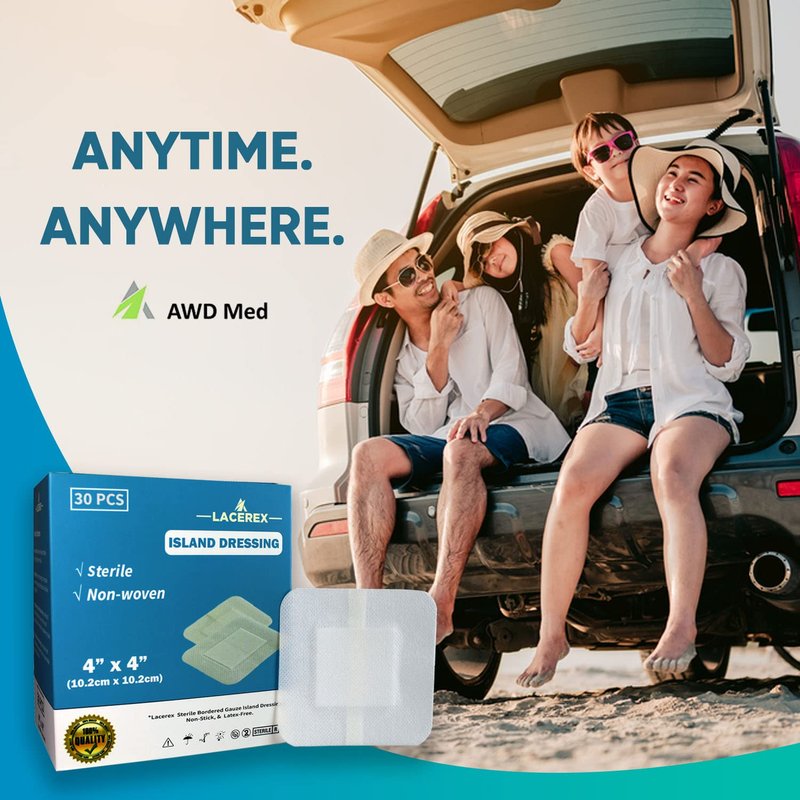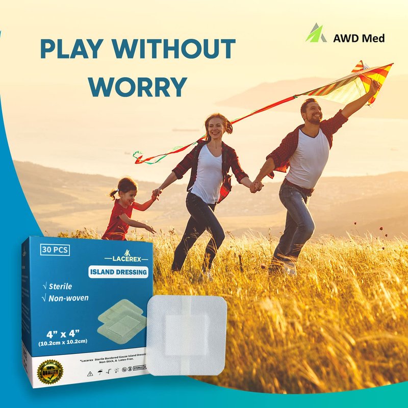 AWD Medical Adhesive Island Dressing, Advanced Wound Dressing, Lacerex Sterile Bordered, Non-Woven Gauze Bandage, Non-Stick, Latex-Free, 4"x4", 30 Pack