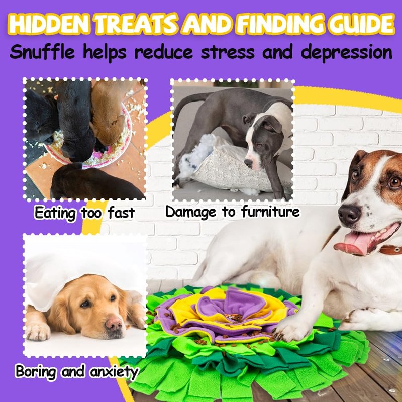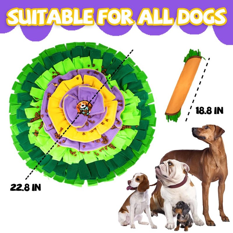 - RICH FEEDING GAME: Multi-layered design and bright colors make your puppy actively nose work and puzzle play. Look at the middle of the snuffle mat. Total 4 layers of petals can hide large chunks of food easily, outer ring of the rich and messy grass suitable for small size of food. It takes time for dogs to sniff to find their favorite treats, Which can reduce the dog's eating speed and training the dog's foraging skills