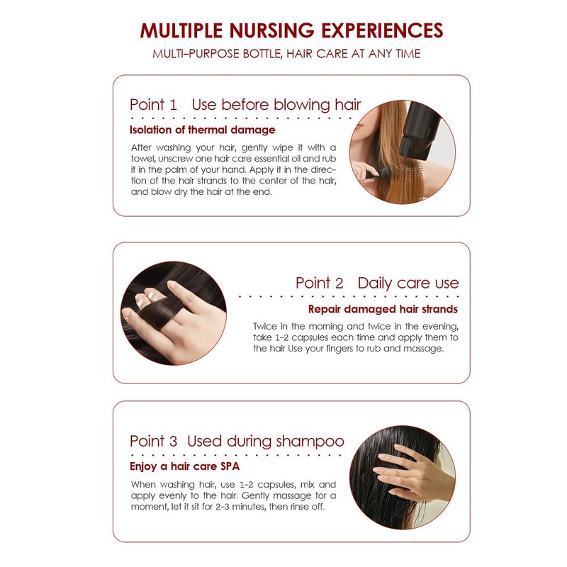 Hair treatment serum contains enriched with avocado, macadamia, and argan oil, and various vitamins repair dry damaged hair and prevents split ends. Hair vitamins serum capsule enriched with vitamin A, B, C, E for your leave it with a luxuriously silky texture! Deeply moisturizing and heat protectant formula will increase your hair shine and reduce frizz and breakage, making your hair softer and stronger. With innovative capsules design, it provides precise quantification. It is hygienic and convenient for on-the-go. With not-greasy formula, no rinse needed for all hair types, including straight, wavy, curly, frizzy, dyed, bleached and more!