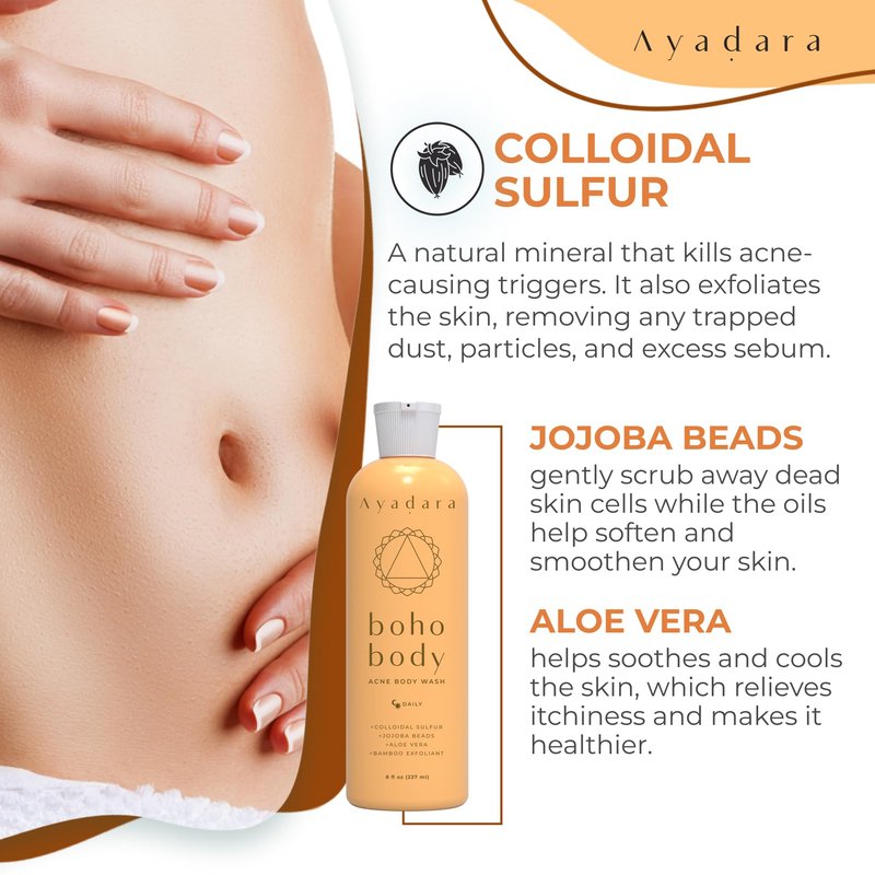While acne is typically associated with the face, it can also occur on the body, such as on the back, chest, and buttocks. Fortunately, Ayadara's body wash for acne is an acne fighting body wash and body wash acne treatment is excellent for you. This exfoliating gel for body can help to clear away impurities for smoother and clearer skin, making it a potent body wash for acne back and chest as well as acne body cleanser, bacne wash and body soap acne alternative.
