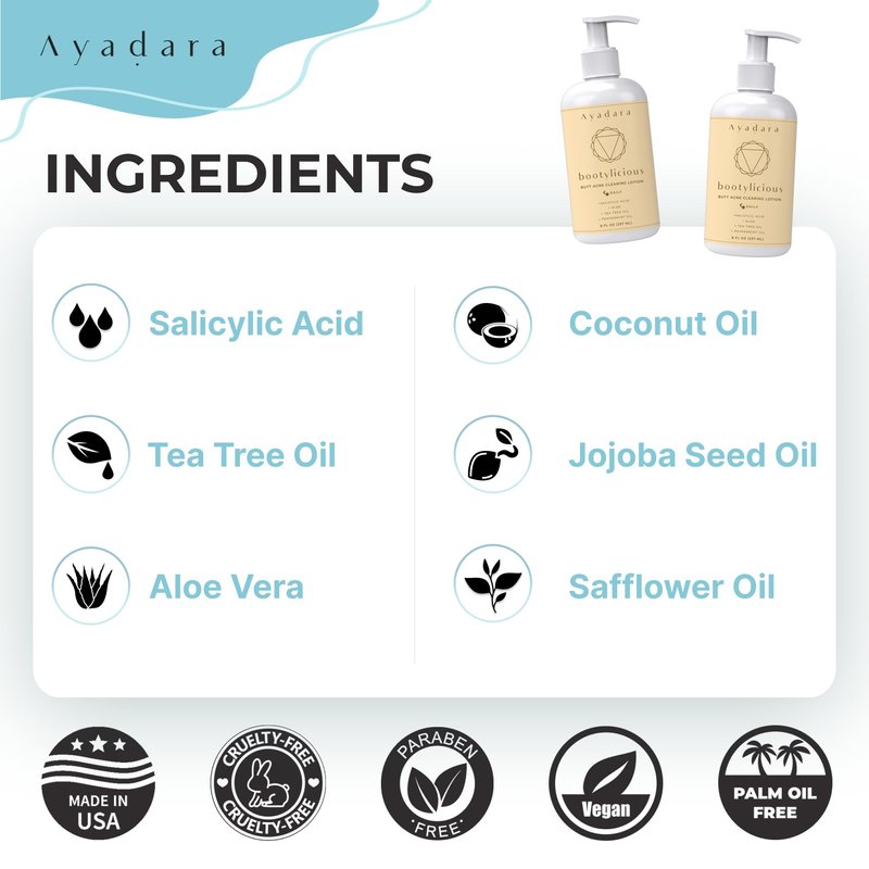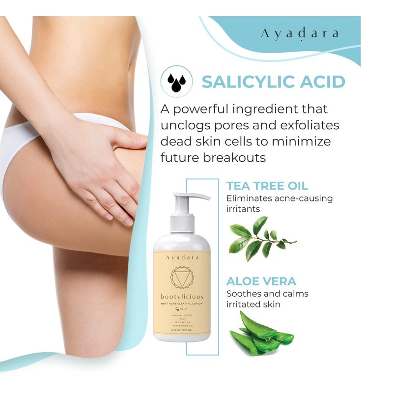 - Targeted Butt Acne Treatment: Ayadara's acne on buttocks treatment is made specifically for butt acne. With gentle ingredients like aloe vera, cucumber extract and eucalyptus, this butt acne lotion clears pimples without dryness or irritation.
