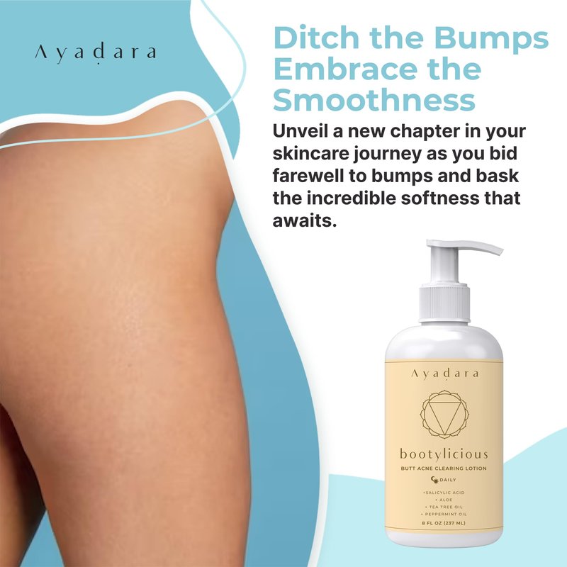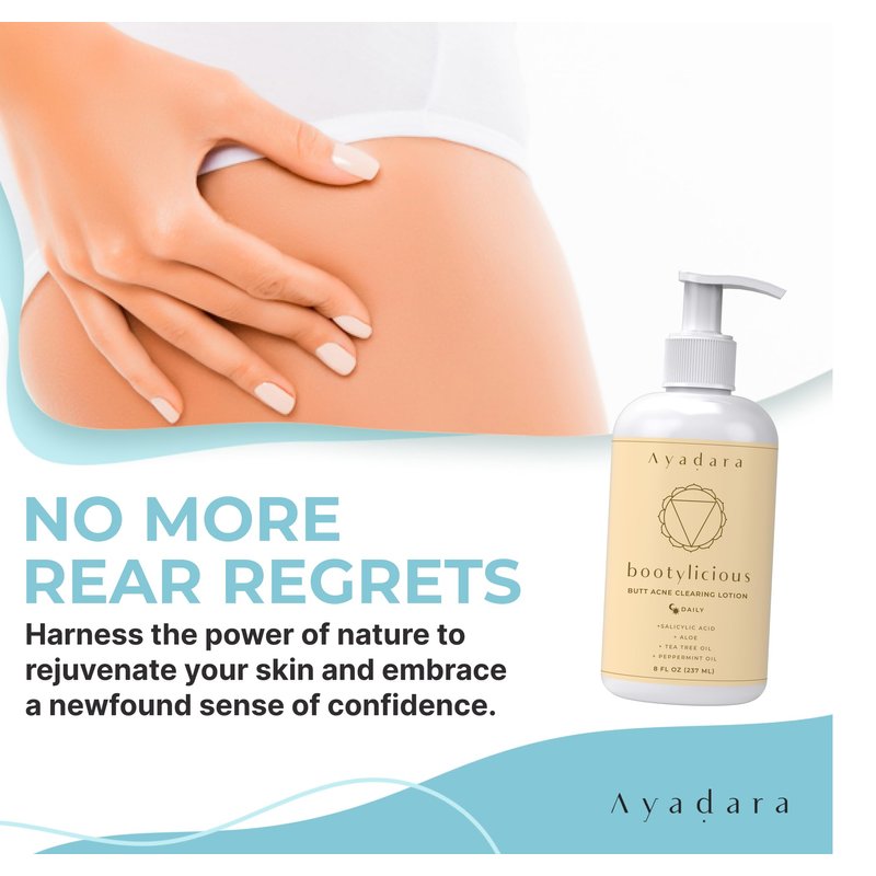 At Ayadara, we understand this struggle. That's why we've created the Ayadara Bootylicious Butt Acne Clearing Lotion — a specially formulated buttocks acne treatment designed to target butt acne, pimples, and even cystic acne. This butt moisturizer works as bum acne treatment butt lotion for women, butt pimples acne treatment, butt pimple cream for women, butt and thigh cream, cream for bumps, butt pimple treatment, butt and thigh acne treatment, and booty cream acne.