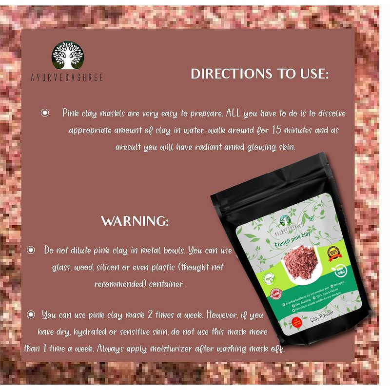 - FACE MASK: Mix AYURVEDASHREE French Pink Clay with water (preferably, rose water) to make a creamy paste. Apply on the skin, avoiding eyes & sensitive areas and leave on for about 15 - 20 minutes before washing off with warm water. You may add honey to the paste for enhanced hydration. Applying 2 times a week as a Face Pack imparts a supple and youthful appearance.