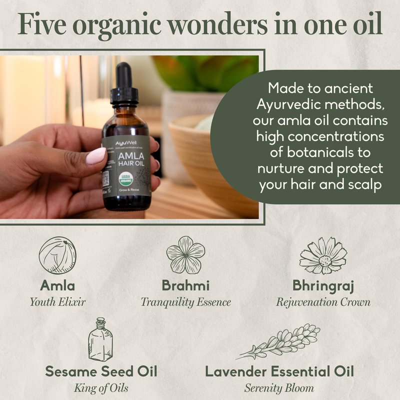 - Nourish Your Hair From Root to Tip, for thicker, stronger, softer hair, naturally. A unique blend of organic amla (Indian gooseberry), bhringraj, brahmi, lavender and sesame oils, AyuWell is your all-in-one hair care solution to help promote growth, reduce shedding, soften and condition for your best hair day ever!
