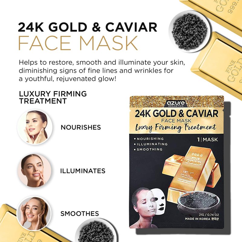 - LUXURY BEAUTY THAT YOU DESERVE: Our brightening caviar and gold face mask contains a blend of 24K Gold and Caviar Extract to help smooth, nourish and hydrate your skin for a soft youthful glow. Our sheet masks help to diminish signs of fine lines and wrinkles for youthful, glowing skin.