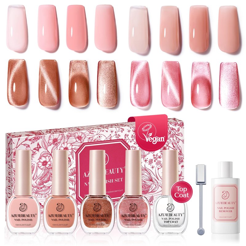 AZUREBEAUTY Cat Eye Nail Polish Set: 4colors nail polish with nude pink glitter holographic nail polish with magnet, 1* Top coat, 1*20ml nail polish remover, 1* magnet .This complete one-stop nail polish experience comes in an exquisite packaging gift box, making it the perfect choice for female friends.