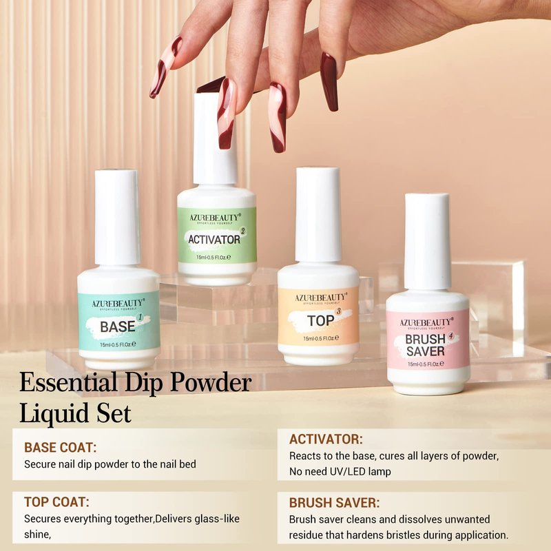 - ★ Fast Drying & Long-Lasting: Dip Base and top coat for 60 seconds to quickly dry, convenient, and fast. AZUREBEAUTY dip powder liquids are anti-chipping, anti-peel off, breathable, and do not damage the nail bed, They can keep the nail art gorgeous and shiny for more than 28 days if proper application