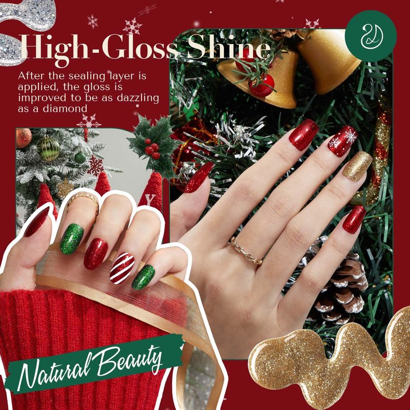 AZUREBEAUTY 4 colors Nail Polish Set: 4 classic Christmas colors red green gold silver nail polish, 1* Top coat. This complete one-stop nail polish experience comes in an exquisite packaging gift box, making it the perfect choice for female friends.