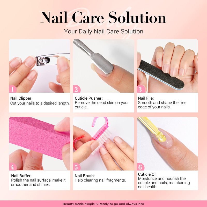 - 10 PCS Nail Soaking Bowl Kit: 1*Nail Soaking Bowl(Note: Nail polish remover is NOT included in the kit), 1*15 ml Cuticle Oil, 1*Nail Clipper, 1*Triangle Cuticle Peeler Scraper, 1*Double-ended Nail Pusher, 1*Nail Brush, 2*Nail File and 2*Nail Buffer. Everything you need for comprehensive nail care
