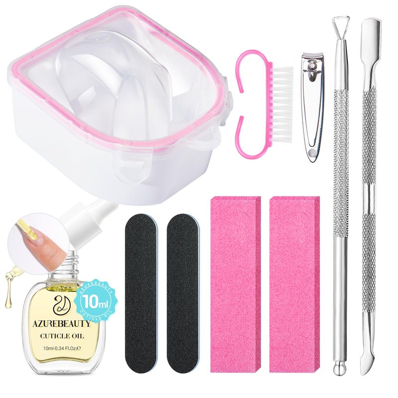 AZUREBEAUTY Nail Soaking Bowl, Soak Off Dip Powder Gel Polish Remover, Manicure Bowl for Hand with 15ml Cuticle Oil Cuticle Remover Tools, Nail Brush, Cuticle Pusher, Cuticle Peeler, Nail File Buffer