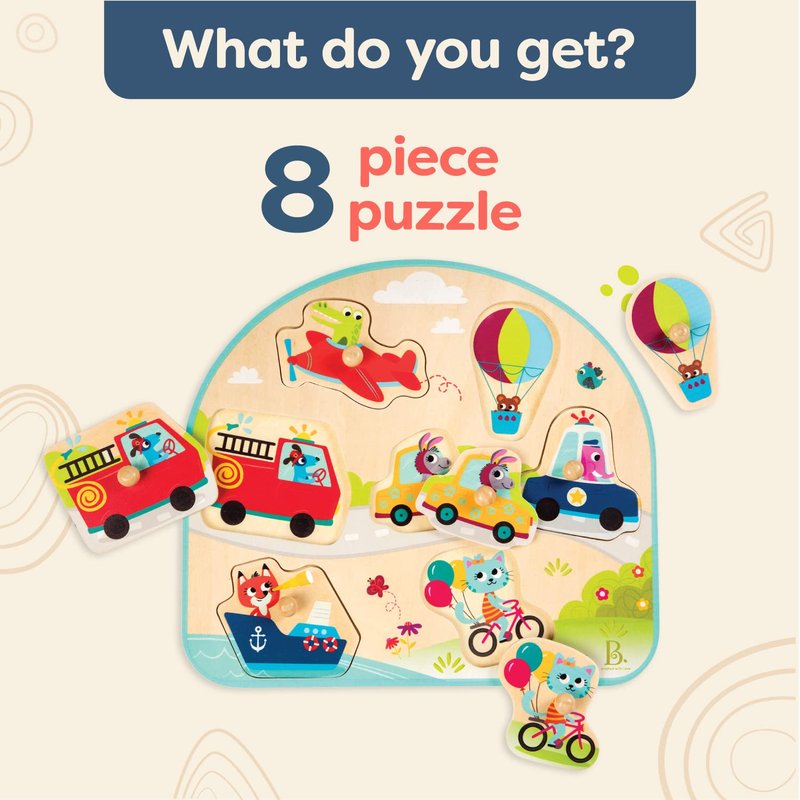 B. toys- Vehicles On The Go!- Wooden Peg Puzzle – Educational Puzzle – Vehicles Peg Puzzle for Toddlers, Kids – 7 Chunky Pieces – 18 Months +