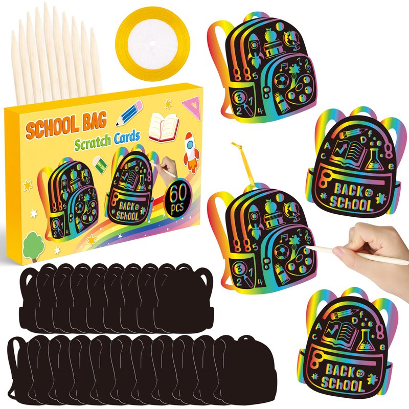 - Back to School Set: You can receive a sufficient quantity of school bag scratch cards, which features 2 styles of book bag scratch cards, 30 sheets each, as well as 20 wooden stylus pens and a bundle of yellow ribbons, kids are free to create unique back to school gifts.