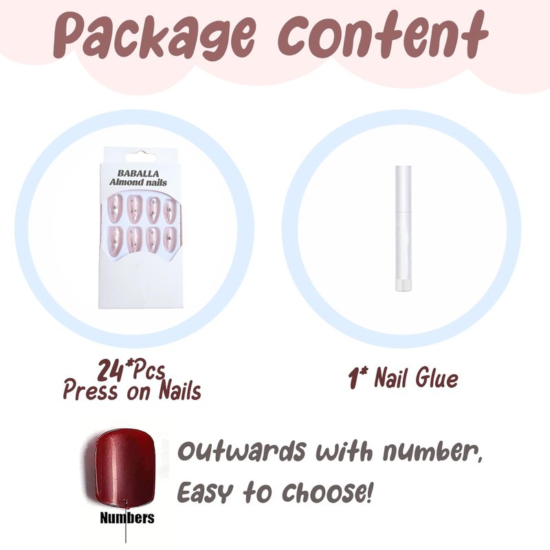 - Package Includes - One boxes of almond press on nails medium 24Pcs in one pack, divided into different sizes, you will definitely find a fake nail that fits your nail size. 1 nail glue included with the package