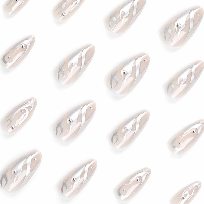 BABALAL Almond Press on Nails Medium Fake Nails Sliver swirl Glue on Nails Rhinestone Stiletto Acrylic Nails with Design