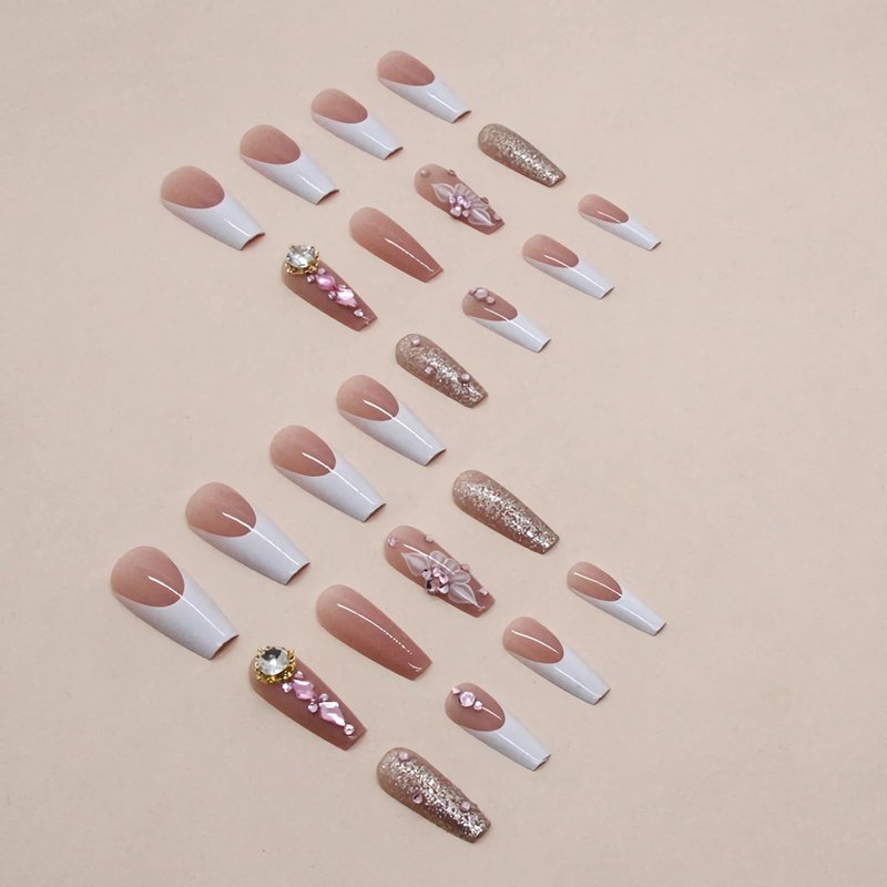 BABALAL Coffin Press on Nails Long Fake Nails White French Glue on Nails Glitter Rhinestone Flower Design Ballerina False Nails 24Pcs Shiny Acrylic Nails for Women and Girls