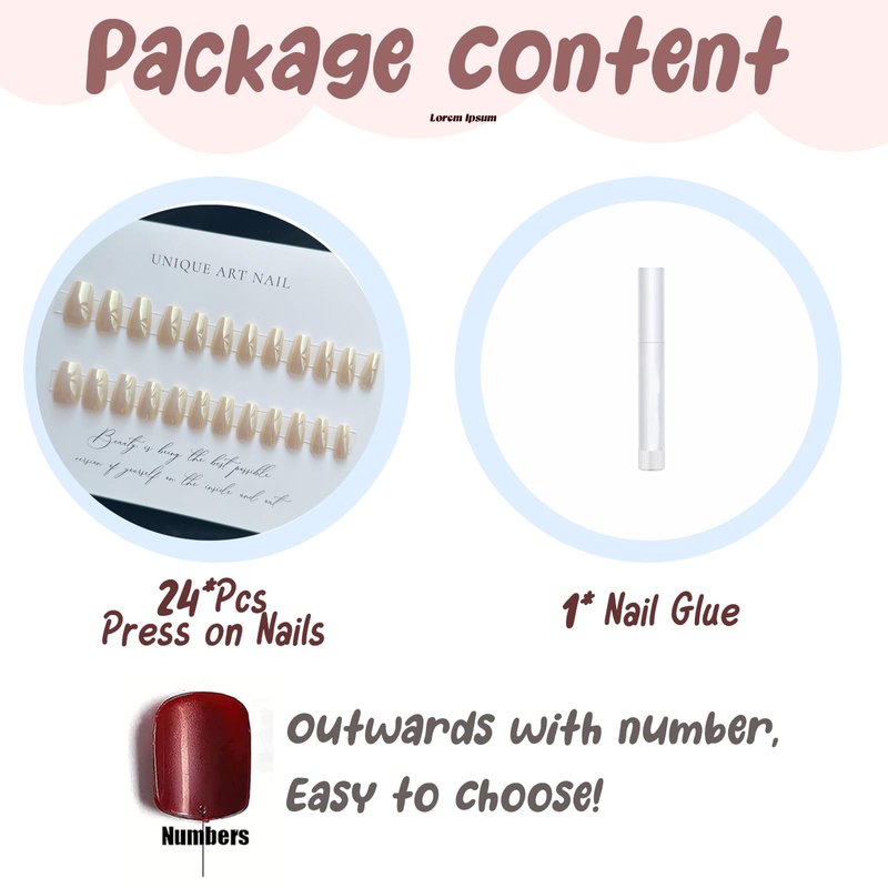 - 【Package Includes】One boxes of coffin press on nails medium(24 pcs) in one pack, divided into different sizes, you will definitely find a fake nail that fits your nail size. 1 Double-side adhesives and 1 nail file included with the package. No need to buy other things, you can get the nail salon-like effect