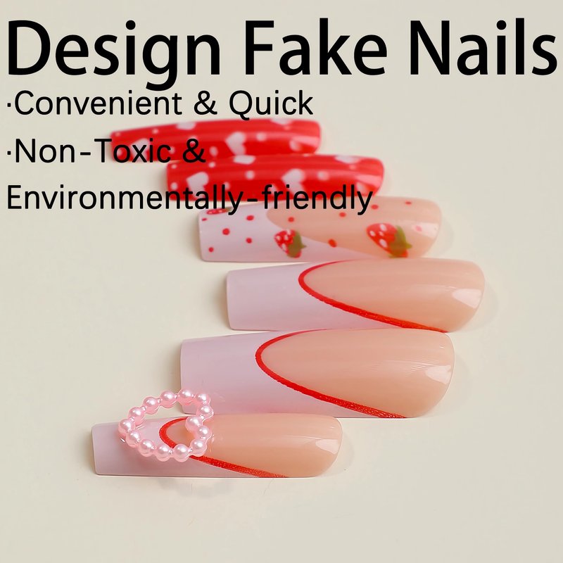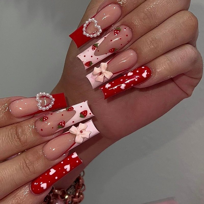 BABALAL Long Square Press on Nails Pink French Fake Nails Red Heart Glue on Nails Pearl Strawberry Design Cute Acrylic Nails Squoval 3d Bow Manicure Valentine's Day False Nails for Women and Girls