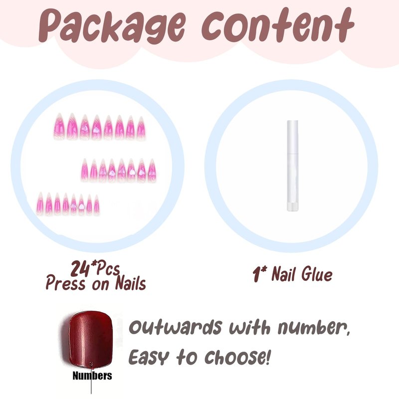- 【Wide Occasions】These fake nails long designs can make you stand out at parties, dates, weddings, valentine Day proms, and Christmas. It can be given as a gift to your wife, mother, girlfriend, daughter or friends. It will bring them a comfortable and convenient manicure art experience