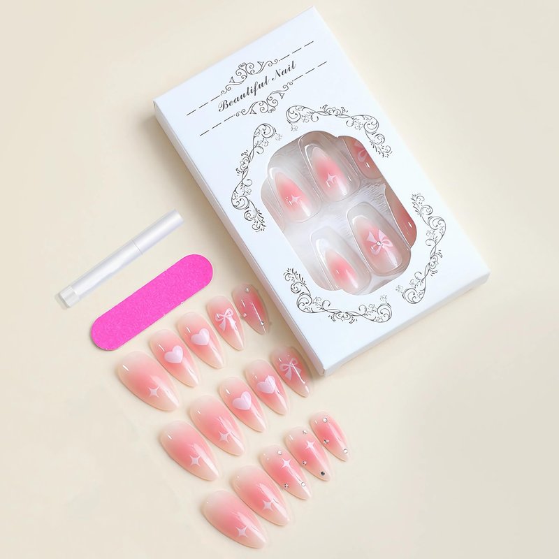 BABALAL Pink Press on Nails Medium Almond Fake Nails Heart Glue on Nails Bow Acrylic Nails Shiny Rhinestone Stiletto 24Pcs Glossy Manicure False Nails