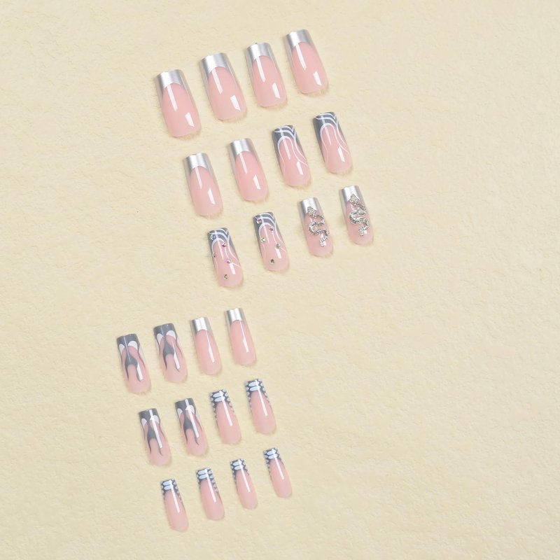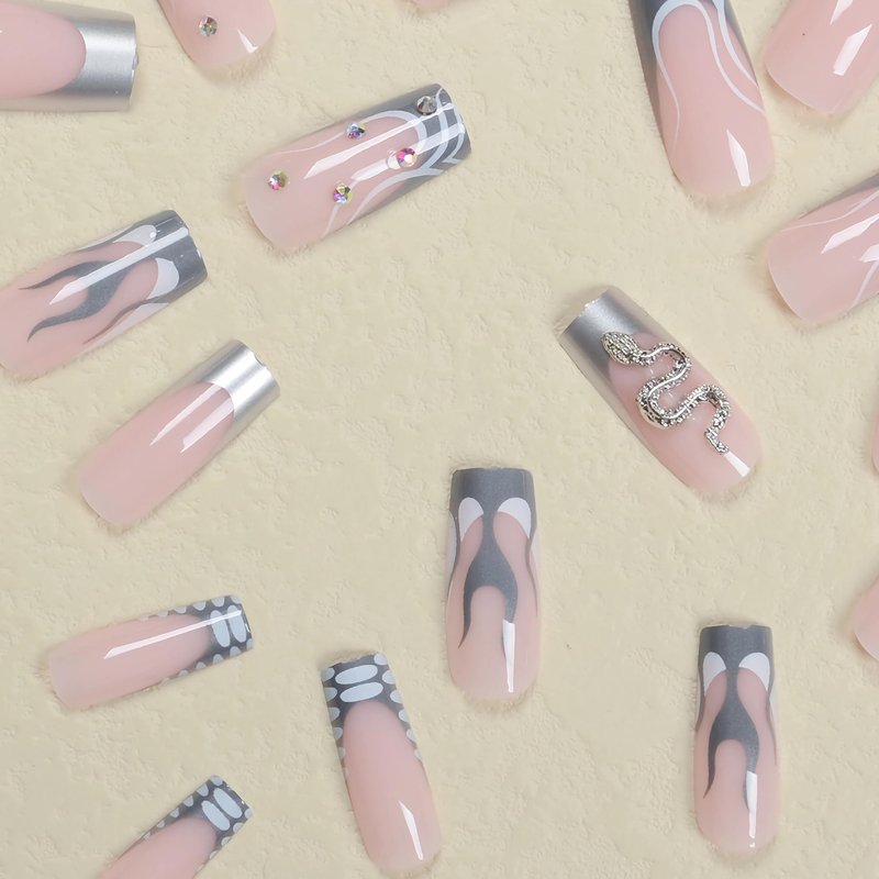BABALAL Square Press on Nails Long Fake Nails Gray French Tip Glue on Nails 3d Snake Charm Metallic Design Goth Acrylic Nails 24Pcs Manicure False Nails