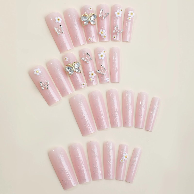 BABALAL Square Press on Nails Long Fake Nails Pink Glue on Nails 3D Butterfly Flower Charm Acrylic Nails 24Pcs Squoval Glitter Manicure Artificial False Nails for Women and Girls