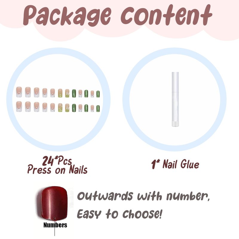 - 【Package Includes】One boxes of square press on nails medium(24 pcs) in one pack, divided into different sizes, you will definitely find a fake nail that fits your nail size. 1 nail glue included with the package. No need to buy other things, you can get the nail salon-like effect