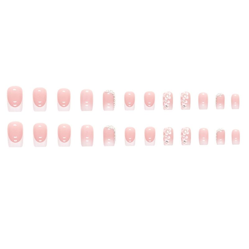 BABALAL Square Press on Nails Medium Fake Nails Pink White French Glue on Nails Squoval Acrylic Nails 3d Flower Rhinestones Stick on Nails for Women and Girls
