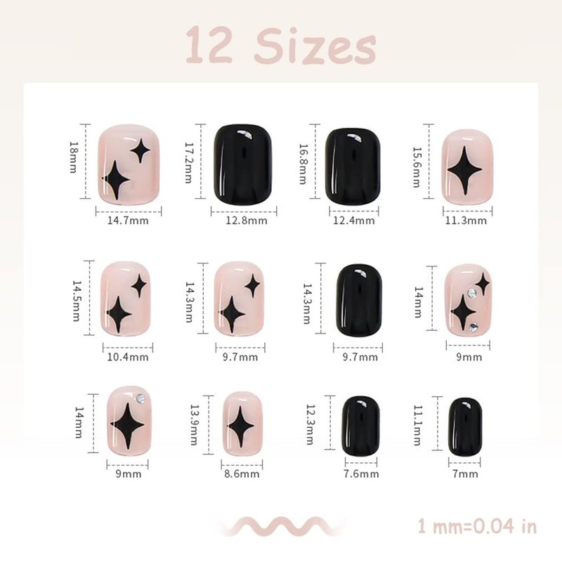 3.12 sizes, 24 pieces short false nails in 12 different sizes, no matter what your nail size is, you can choose the most suitable size for yourself. It is easy to trim and file them to in any length and shape you like