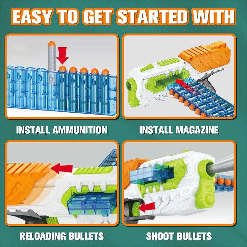 - EASY LOADING: Sliding magazine with 10 rounds of ammo allows for continuous play.