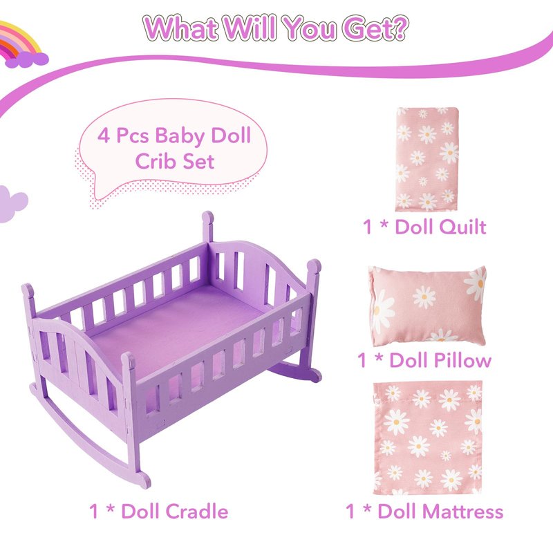 BABESIDE 4 Pcs Baby Doll Bed with Baby Doll Bedding Set For 4-6 Inch Mini Baby Dolls, Wooden Baby Doll Crib Baby Doll Furniture Set for Kids Pretend Play Toys, Purple Baby Doll Cradle Package Included: 1* Baby Doll Crib, 1* Baby Doll Pillow, 1* Doll Mattress, 1* Doll Quilt