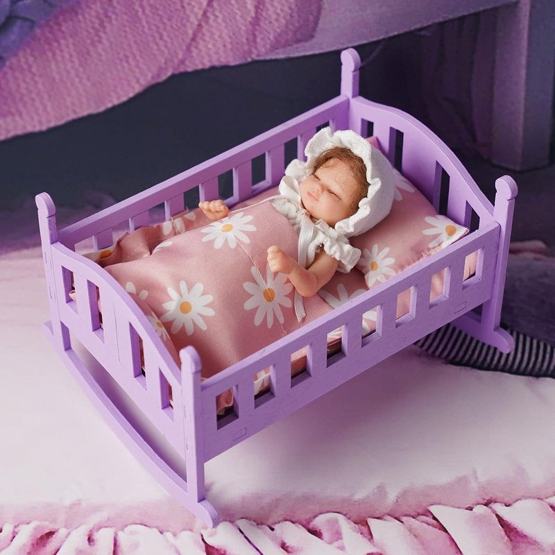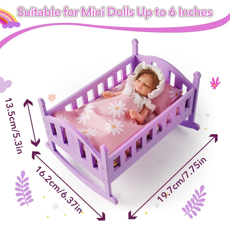 BABESIDE 4 Pcs Baby Doll Crib Set for 4-6 Inch Mini Baby Dolls, Wooden Baby Doll Bed Doll Furniture with Doll Bedding Set, Baby Doll Cradle for Kids Pretend Play Toys, Purple