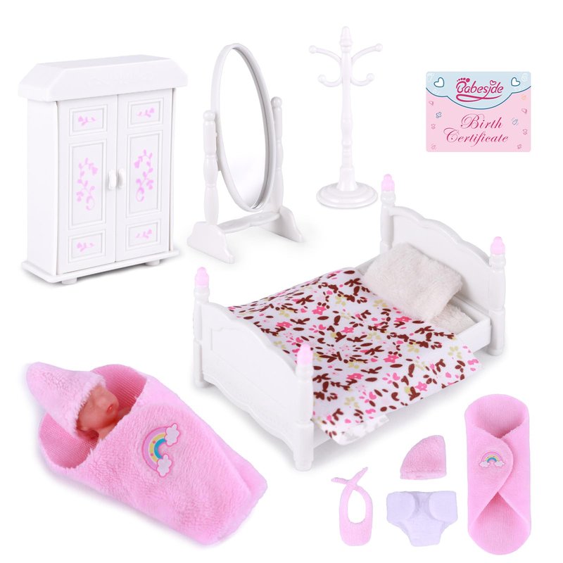 - You will receive: mini full silicone doll*1, clothes*1, birth certificate*1 and mini bedroom furniture set.each Mini Baby comes with accessories to match their babies and toy sets.