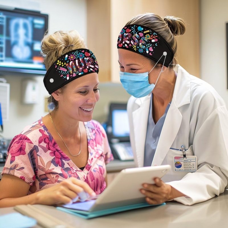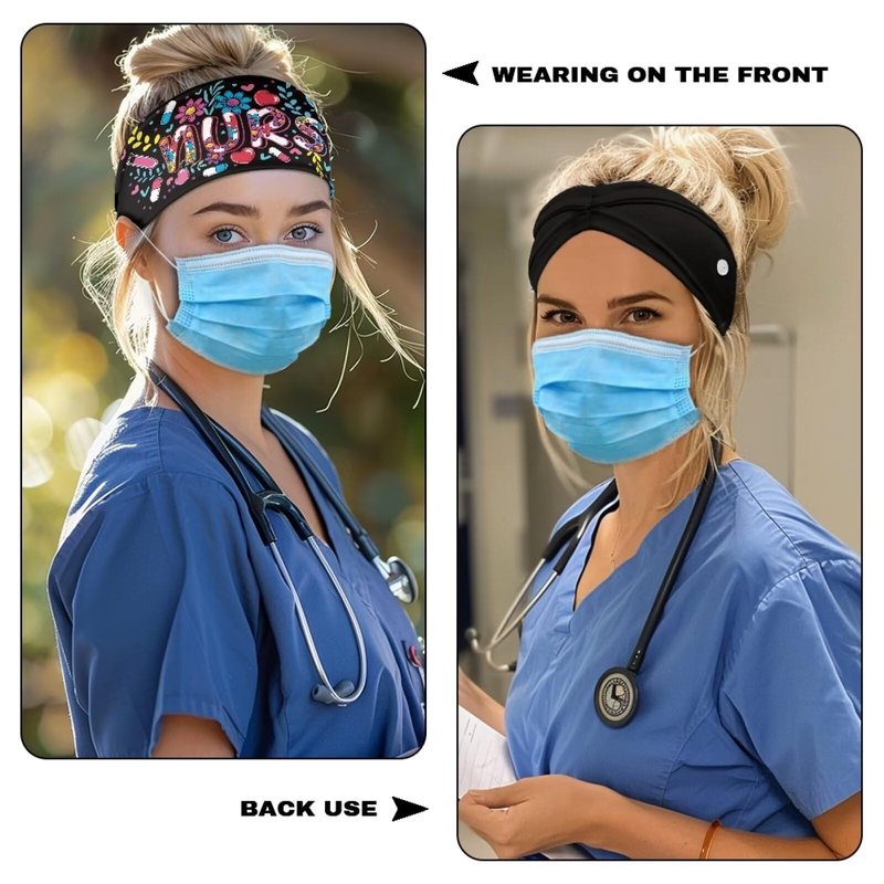 Babrukda Nursing Headbands for Women with Button for Mask Doctor Nurse Sweatband Fashion Flower Print Hair Bands Turban Women Men Head Wrap Elastic Headwear Headwrap for Working