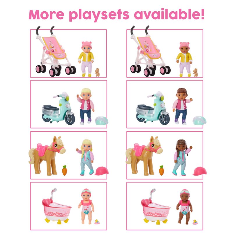 - GET READY FOR MINI ADVENTURES: It’s time to get exploring with the BABY born MINIS! Ready to join your little one on their explorations, this scooter playset comes complete with a mini doll and removable helmet with visor.
