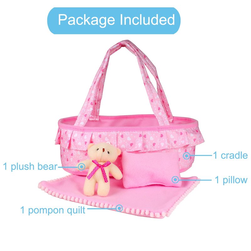 - Package Listing : Includes 1 baby doll bassinet,1 pillow, 1 quilt,1 bear. This baby doll carry bag fits for dolls smaller than 12 inch.Cradle size:12'' X 7.5'' X 4''. The cradle bassinet is especially designed with THICKER interlayer than others. Dolls are not included