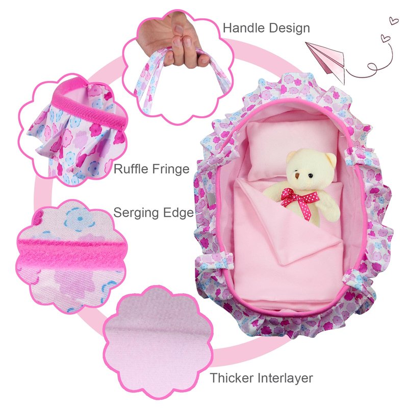 Baby Doll Cradle Bassinet Portable Doll Carrier Carry Bag Doll Bed,Baby Doll Accessories Playset,with Doll Clothes Soft Pillow Quilt Blanket Bear,for 8-9-10-11-12 Inch Smaller Alive Baby Doll