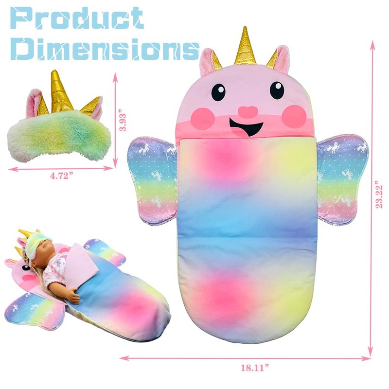 - Doll rainbow unicorn sleeping bag include 1 sleep bag, 1 eye mask.(note: dolls are not included). Made of fabric cloth, Lightweight and soft,Practical and easy to clean.
