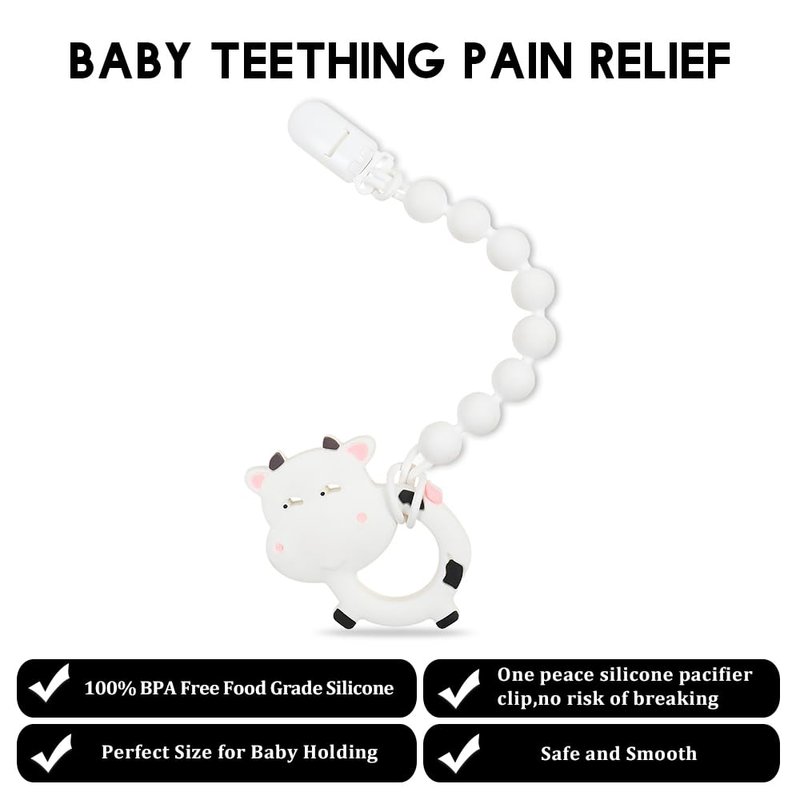 Baby Food Grade Silicone Teether Toy with One Piece Design Pacifier Clip Holder,Teething Pain Relief Toys Gift Set for 3 Months+ Boys and Girls,Freezer Safe,BPA Free. (Cow)