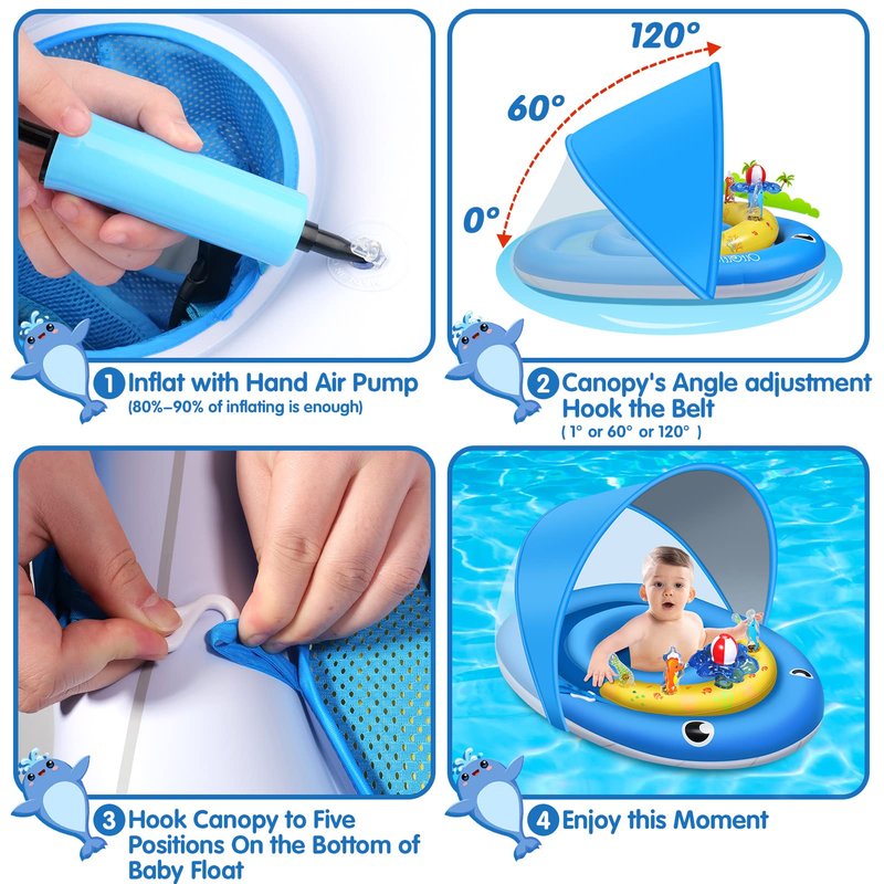 - Bath and Pool Floatie: Unique and cute whale swim ring for bathtubs, pools, and beaches for infants and toddlers 6-24 months. Features an adjustable safety seat, and dual inflation chamber, 20% wider for superior buoyancy/stability in water, and does not flip over.