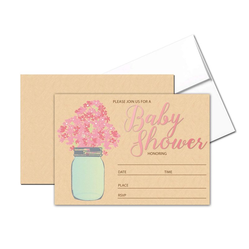 - Rustic mason jar and pink flowers look fill in shower invites for the new arrival.