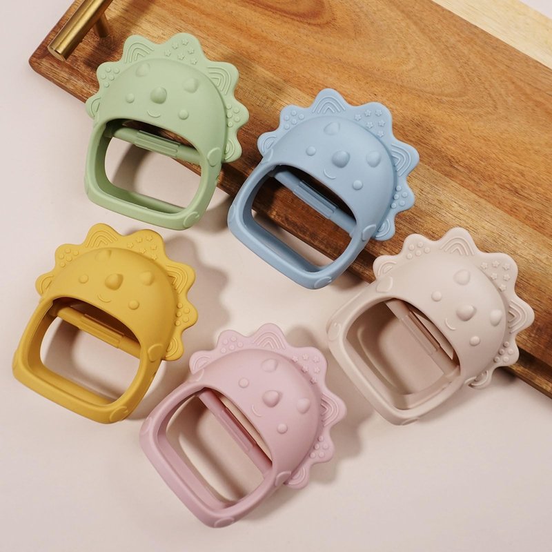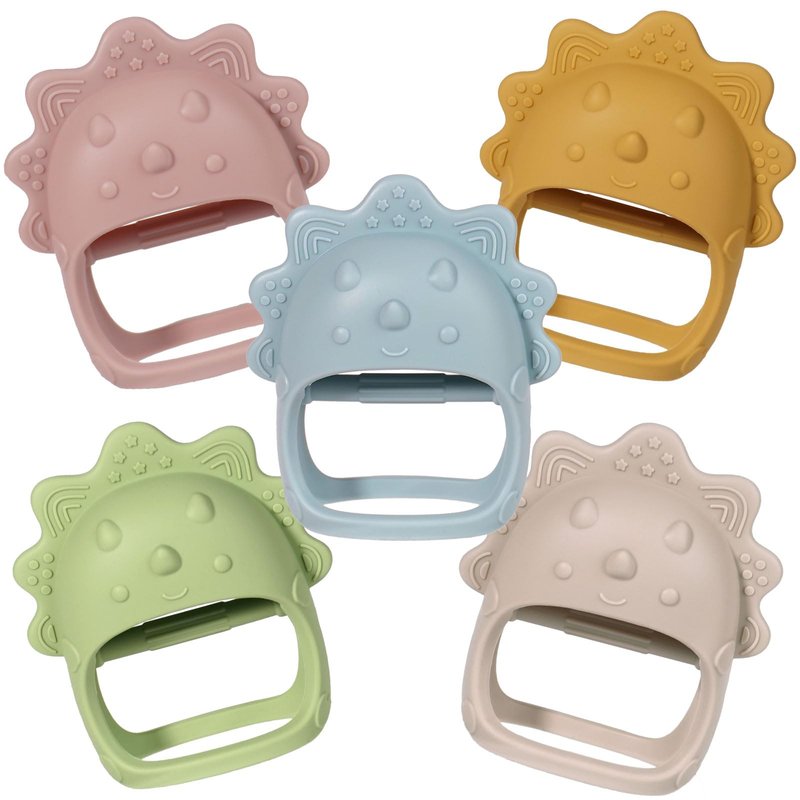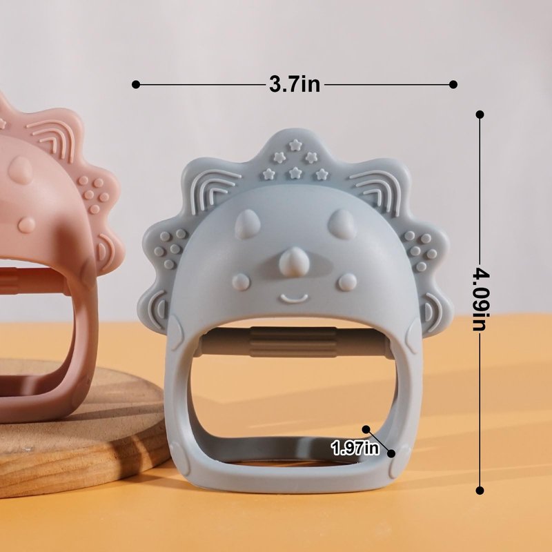 - Thoughtful Design: The teething mittens are designed in the shape of a triceratops to attract your baby's interest. The lever in the middle can train your baby's grasping ability. The perfect size of hand teething toys won't easily strangle your baby's hands.