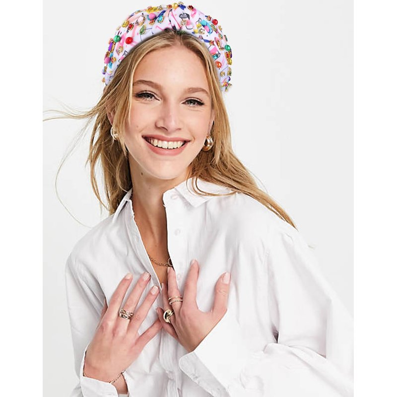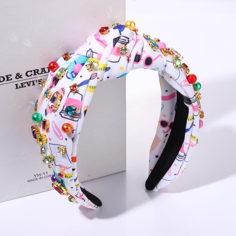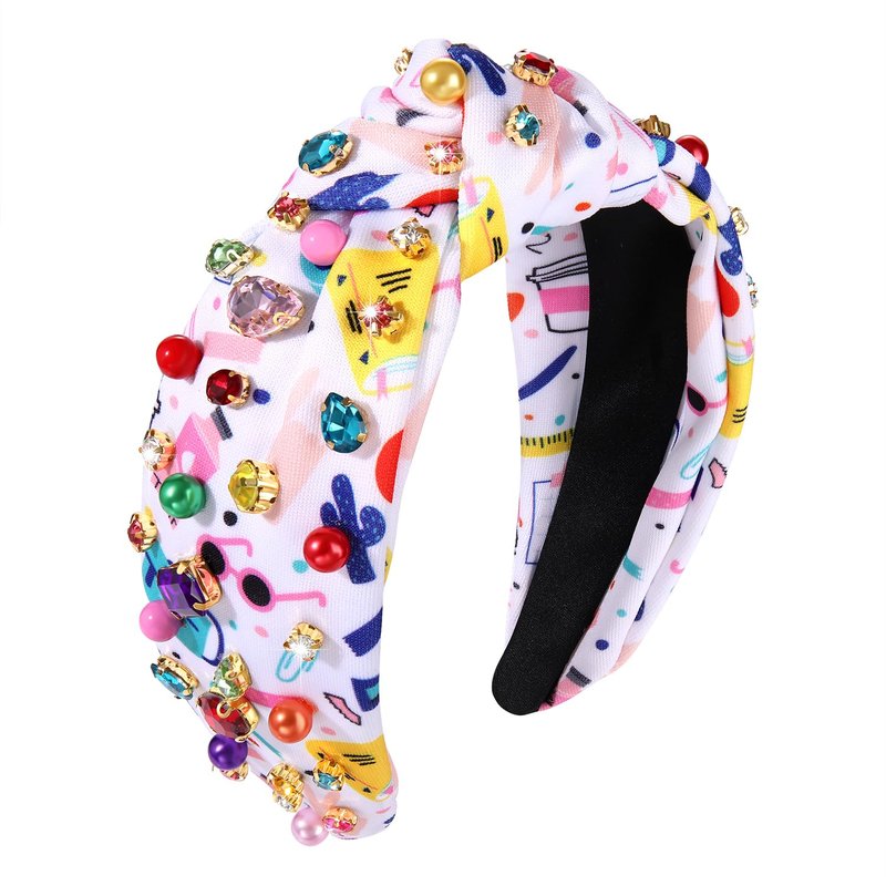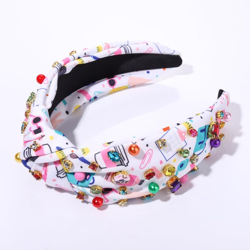 Back to School Headband Colorful Crystal Beads Knotted Headband Cute School Teacher Pattern Top Knot Twist Hairband Headpieces Boho Spring Summer Headband Hair Accessories for Teacher Student (back to