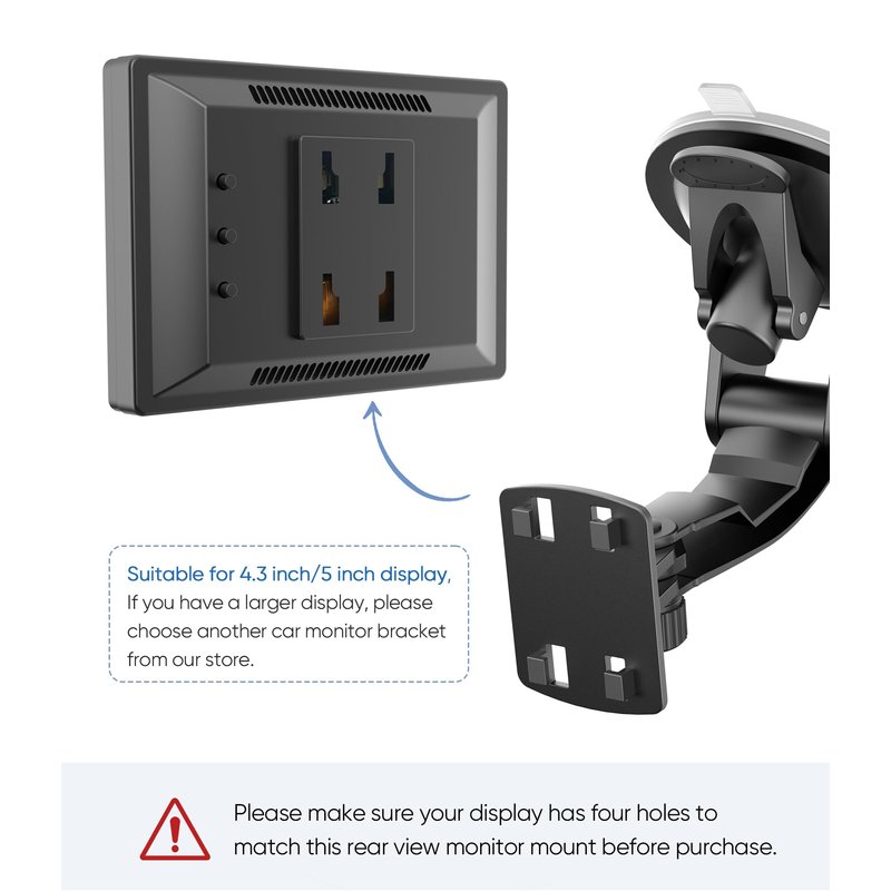 - This suction cup camera monitor mount is suitable for 4.3 inch/5 inch display, please make sure your display has four holes to match this rear view monitor mount before purchase. If you have a larger display, please choose another Car monitor bracket from our store.