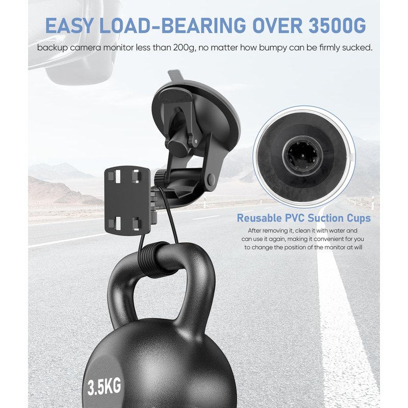 - Mount bracket for display monitor comes with two adjustable knobs to better meet the needs of the driver, and every angle can enjoy a good visual effect. The windshield mount for backup camera monitor is compact, so you don't have to worry about blocking the view.