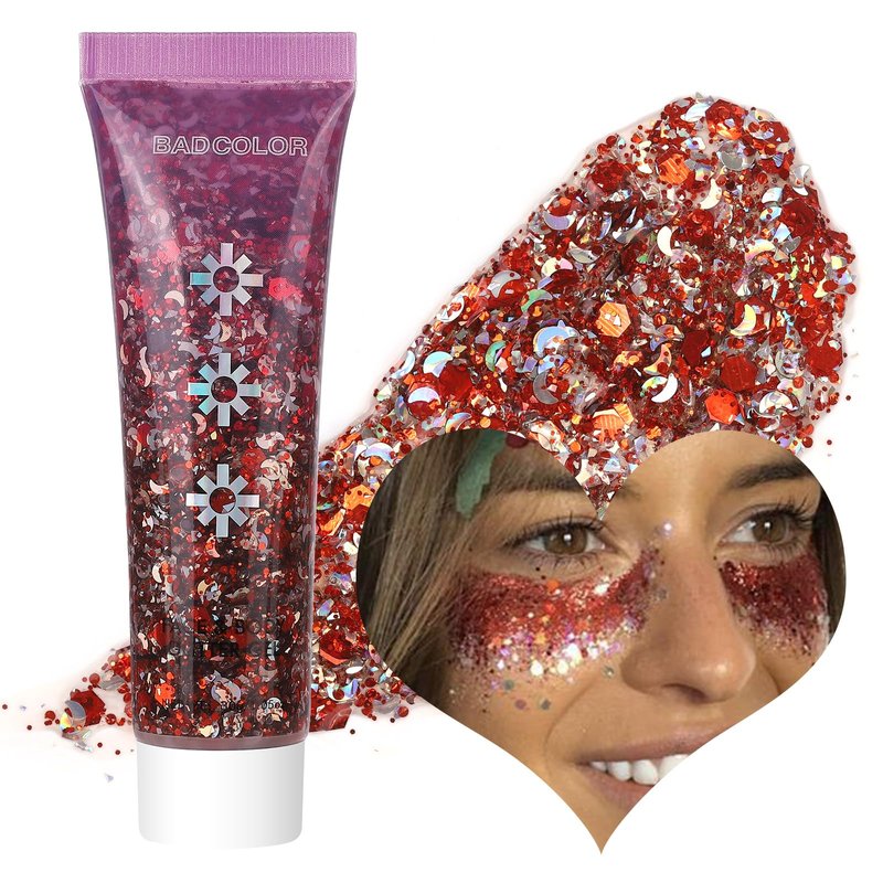 BADCOLOR Red Face Body Glitter Gel, Holographic Shimmer Chunky Glitters Makeup for Hair Nails Eye Lips, Music Festival Concert Rave Accessories Party, Long Lasting Sparkling Mermaid Sequins Gel Kit