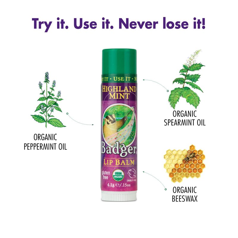 - One 0.15 ounce tube of badger balm highland mint lip balm